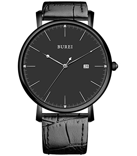 Best Seller! BUREI® Unisex Ultra-thin Elegant Classic Date Quartz Watch with Black Calfskin Leather Band, Black Dial Review