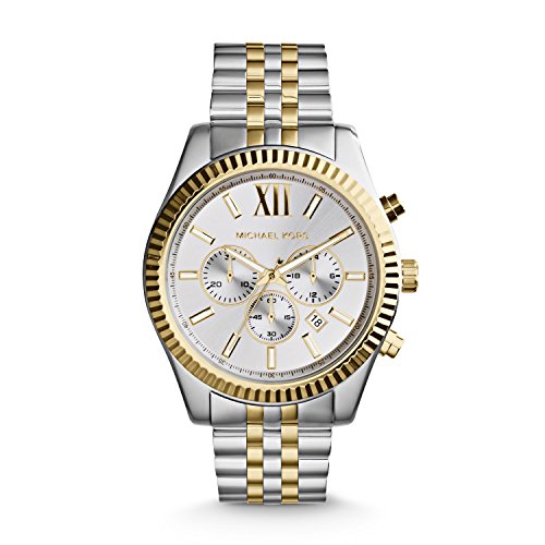 This men's Michael Kors Lexington watch is made from two-tone steel/gold plate and is powered by a chronograph quartz movement. It is fitted with a two tone bracelet and has a silver dial. The watch has a date function.
