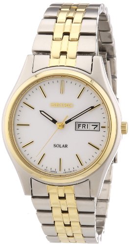 Stylish Seiko Solar watch in two-tone steel and gold plate, featuring a white dial with day and date functions, plus baton hour markers. The watch fastens with a classic bracelet.