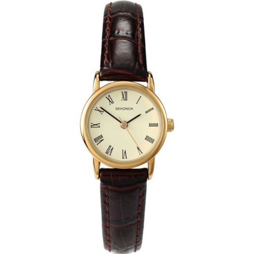 Elegant ladies Sekonda model in PVD gold plating and brown leather. The traditional cream dial is set with Roman numeral hour markers.